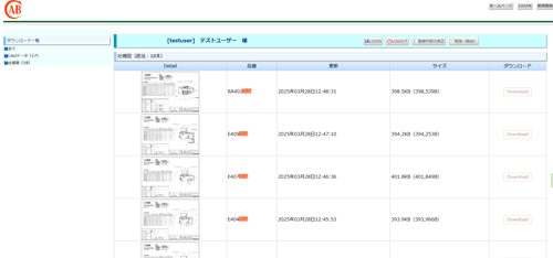 ログインするとダウンロードページが表示されます。 CADデータ、仕様図、カタログそれぞれダウンロードが可能になります。